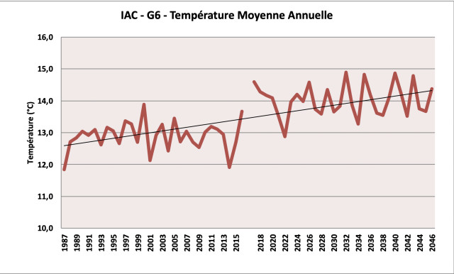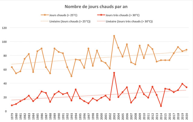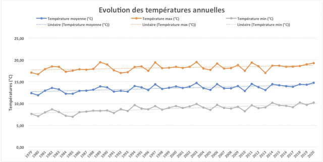 La hausse tendancielle des températures annuelles se confirme localement sur la période d'analyse, à l'image de la situation plus générale en France. Cette hausse concerne tous les paramètres (températures moyennes, minimales et maximales) et provoque ici des risques d'échaudage (voir plus bas). On observe également une hausse des jours chauds (> 25°C) et des jours très chauds (> 30°C).