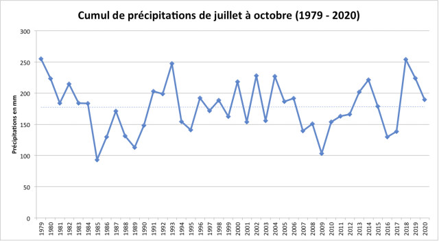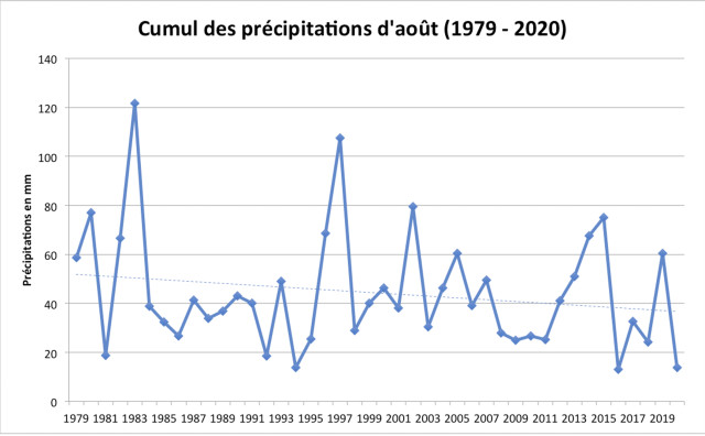 Voici le cumul des précipitations sur la période déclarée de sècheresse par Laurent Paul : juillet à octobre, de 1979 à 2020. Ces données climatiques n'appuient pas vraiment le constat de l'agriculteur : la tendance des précipitations est constante. Cependant, cela est expliqué par les graphiques ci-dessous, qui isolent les précipitations des mois de juillet et d'août. Ainsi, on remarque que la tendance est à la hausse pour le mois de juillet, et à la baisse pour le mois d'août. Les précipitations des mois de septembre et d'octobre sont constantes sur les 30 ans. Ainsi, pour cette exploitation et pour la sécheresse, le changement climatique ne s'exprime que sur le mois d'aout, qui semble contrebalancé par un mois de juillet plus pluvieux. D'après les déclarations de Laurent Paul, la pluie est désormais répartie de manière hétérogène sur la période juillet – octobre : une sécheresse prolongée, avec des orages intermittents. Les graphiques de juillet et août semblent appuyer ce constat.
