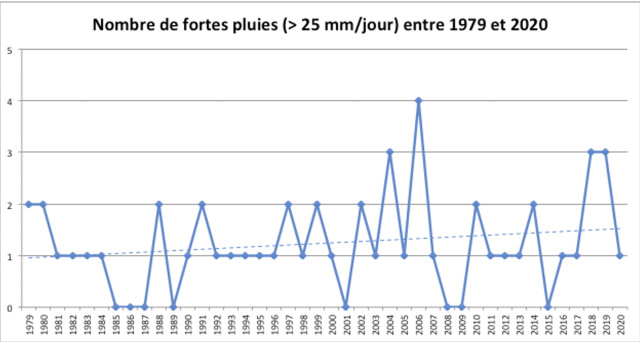 Voici le cumul des précipitations sur la période déclarée comme excédante en eau par Laurent Paul. On remarque une petite augmentation, qui reste assez modérée sur les 30 dernières années. De plus, en regardant le graphique ci-dessous, qui présente le nombre de fortes pluies annuelles (>25 mm par jour), on peut voir également une augmentation. Ainsi, l'aléa d'excès d'eau tend à augmenter de façon modérée, même si on peut remarquer sur les deux graphiques que les dernières années (depuis 2017) semblent beaucoup plus sujettes à cet excès.