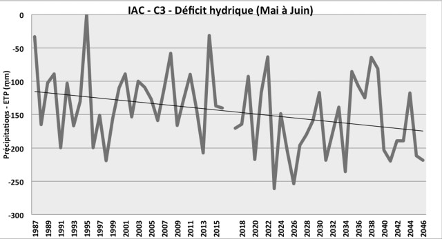 Le déficit hydrique est la différence entre les précipitations et l'évapotranspiration des cultures, donc grossièrement la différence entre les entrées et sorties d'eau. Ici, le graphique présente le déficit hydrique de la période printanière, qui conduira à un été sec. Cela correspond également aux étapes de montaison puis de remplissage de l'épi de céréale, et de floraison pour les légumineuses telles que la lentille, donc une période clé pour le rendement. On remarque que la tendance est à la baisse à l'horizon 2050, la sécheresse sera donc accrue, et de plus en plus tôt dans l'année.
