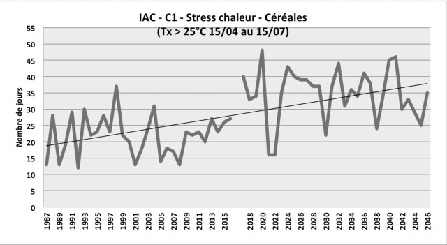 Cet indice est un dénombrement des jours avec des températures maximales strictement supérieures à 25°C de mi-mai à mi-juillet. Cette période englobe l'épiaison et la floraison des cultures céréalières, pendant lesquelles elles sont particulièrement sensibles au phénomène d'échaudage thermique, accident de croissance des grains. On remarque donc une nette augmentation de ce nombre de jours à l'horizon 2050, ce qui pourrait causer des pertes de rendement supplémentaires sur les céréales par échaudage, mais aussi des dégâts sur les cultures de légumineuses, notamment le soja et la lentille, très sensibles au stress thermique.
