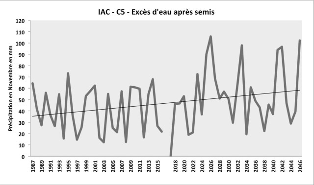Cet indicateur présente le cumul des précipitations durant le mois de Novembre, qui évalue donc le risque d'excès d'eau après le semis. Une quantité d'eau stagnante entraîne un déficit d'oxygène pour la plante : or les premières étapes du cycle de développement (germination – levée) sont très sensibles à l'hypoxie. Plus ce phénomène d'ennoiement continu perdure, plus les impacts seront importants, du retard de développement jusqu'à la destruction des pieds au-delà de 10 jours consécutifs, notamment pour le blé. C'est donc un aléa critique pour les cultures d'hiver de l'exploitation. À l'horizon 2050 et d'après les projections, ces précipitations deviennent plus irrégulières et variables, avec une tendance à l'augmentation.