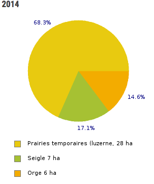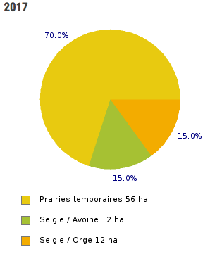 Céréales : 40 t du mélange avoine/seigle/orge 20 qx/ha (55 t de deux mélanges, seigle / orge et seigle / avoine (permettant une autonomie en concentrés de 75%). Rendements des mélanges : 30 q /ha en 2017).