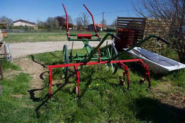 Porte outil de maraichage auto construit par Virginie, Lucie et Julien. Il permet d’utiliser une large gamme d’outils adaptables et réglables (bineuse à soc patte d’oie). Ce système possède un système d’auto conduite combinée permettant une correction facile et rapide de tout écart du cheval ou de mieux suivre une ligne de plantation qui n’est pas totalement rectiligne. Cet outil a été réalisé grâce aux formations délivrées par Hippotèse et l’atelier paysan. (cf photo)