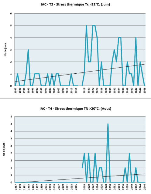 L’inertie climatique à l’échelle du globe implique une continuité des évolutions climatiques déjà observées localement dans les prochaines décennies. Les Indicateurs Agro-Climatiques suivant sont construits à partir des projections climatiques locales et illustrent les principaux enjeux climatiques pour un système maraichage diversifié.