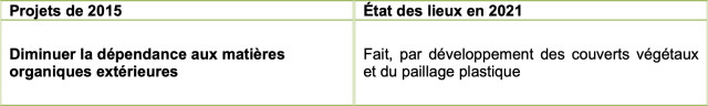 La forte dépendance en matière organiques extérieure est réduite depuis 2019, car l’usage de bâches plastiques a été plus répandu (du fait du problème de courtilières), et il y a eu également plus de couverts végétaux.