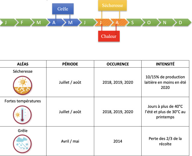 Pour l'aléa de sécheresse, les prairies de l'exploitation ont une pousse de l'herbe plus limitée durant les périodes sèches, en juillet août. Cela baisse donc le rendement foin. Les animaux souffrent de la chaleur, et ont donc une production de lait plus faible, jusqu'à 10 à 15% en moins par jour sec et chaud.