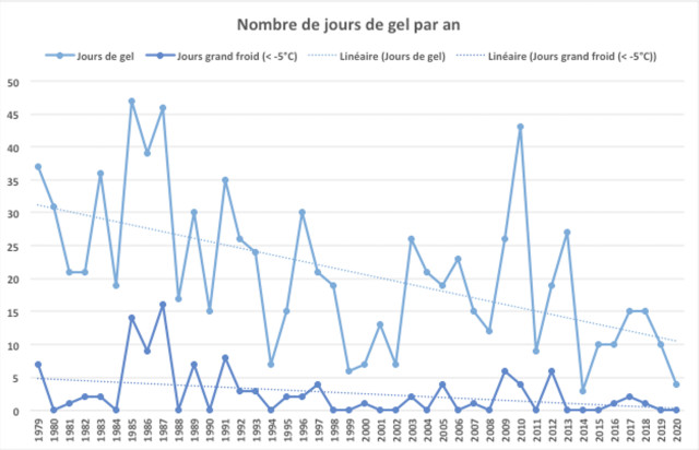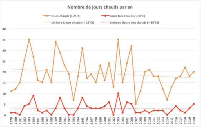 La hausse tendancielle des températures annuelles se confirme localement sur la période d'analyse, à l'image de la situation plus générale en France. Cette hausse concerne tous les paramètres (températures moyennes, minimales et maximales) et provoque ici une maturité des fruits plus précoce et des dégâts sur les fruitiers (voir plus bas). Cependant, les jours chauds (> 25°C) et très chauds (> 30°C) ne sont pas en hausse, les premiers étant même en diminution. De plus, les jours de gel et de grand froid (- de 5°C) sont en baisse. L'extrême haut des températures ne semble donc pas être le plus problématique. On remarque cependant une hausse des jours chauds et très chauds dans les dernières années (depuis 2018).