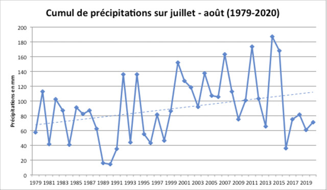 Voici deux graphiques pour illustrer la sécheresse déclarée par Patrice Giard en juillet-août. Le déficit hydrique est la différence entre les précipitations et l'évapotranspiration des cultures, donc grossièrement la différence entre les entrées et sorties d'eau. C'est un bon indicateur pour caractériser la sécheresse. Ici, sur les deux graphiques, on observe que la tendance sur les 40 dernières années n'est pas un assèchement, au contraire. Les précipitations ont augmenté et le déficit hydrique a diminué. Ainsi, le changement climatique ne semble pas se traduire par une sécheresse estivale, mais par plus de pluies, peut-être d'orages estivaux. Cependant, comme Patrice Giard le mentionnait, il semble y avoir un déficit en eau depuis 2018. D'après les projections (voir plus bas), la tendance de ces trois années se poursuivra les années à venir.