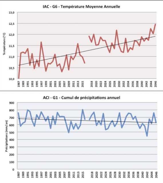 Le déficit hydrique présenté ici s'étale sur la période avril-septembre, correspondant à la période majoritaire de besoin en eau des plantes, pour la croissance végétative ou pour le cycle reproductif. Pour les vergers de l'exploitation, cette période comprend les stades de floraison et de fructification, et de maturation du fruit, et la période de pousse majoritaire pour les prairies. Là où les observations des 40 dernières années tendaient vers une diminution du déficit hydrique (donc plus d'eau disponible aux plantes), les projections indiquent une légère augmentation de ce déficit. Les impacts devraient donc être modérés.