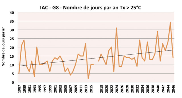 Cet indicateur présente le nombre de jours par an où la température maximale journalière est supérieure ou égale à 25°C. C'est un indicateur général qui nous sert ici à englober tous les dommages causés par la chaleur aux vergers. On remarque donc que le nombre de jours de plus de 25°C a tendance à augmenter à l'horizon 2050, il y aura donc sûrement plus d'impacts sur les vergers. Il serait peut-être intéressant pour Patrice Giard de replanter des nouveaux vergers aux variétés (porte greffe et greffon) plus tolérantes à la chaleur.