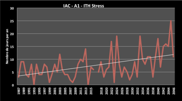 L'Indice Température Humidité (ITH) évalue le couple température et hygrométrie pour déterminer le niveau de stress thermique des animaux. Sur ce graphique figurent le nombre de jours de stress thermique par an. Ainsi, d'après ces projections, l'évolution du climat local va faire presque doubler le nombre de jours de stress thermique des animaux. D'autant plus de jours où les animaux seront moins productifs en lait et leur croissance ralentie. Il faudra réfléchir à des pratiques d'adaptation, comme introduire une race plus rustique par exemple.
