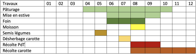 Le foin s’opère entre le 20 juin jusqu’à fin juillet. La moisson est début août. La récolte de pomme de terre se fait entre début août et fin septembre et la carotte de mi-août à fin décembre (car il n’y a actuellement pas de stockage pour la conserver.