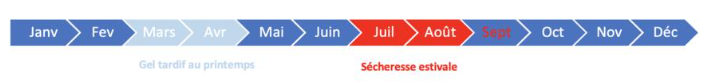 L’inertie climatique à l’échelle du globe implique une continuité des évolutions climatiques déjà observées localement dans les prochaines décennies. Les Indicateurs Agro-Climatiques suivant sont construits à partir des projections climatiques et illustrent les principaux enjeux climatiques à l’horizon 2050 pour lesquels des adaptations seront nécessaires.