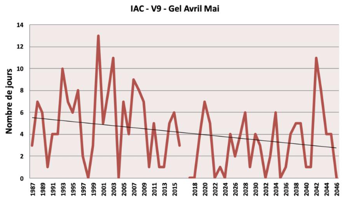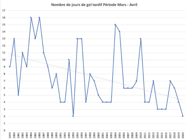 Le risque de gel tardif a été analysé ici sur la période mars-avril au travers du nombre d’occurrences de jours de gel par an depuis 1979. Ce risque s’amenuise tendanciellement avec toutefois la persistance d’une très grande variabilité interannuelle.
