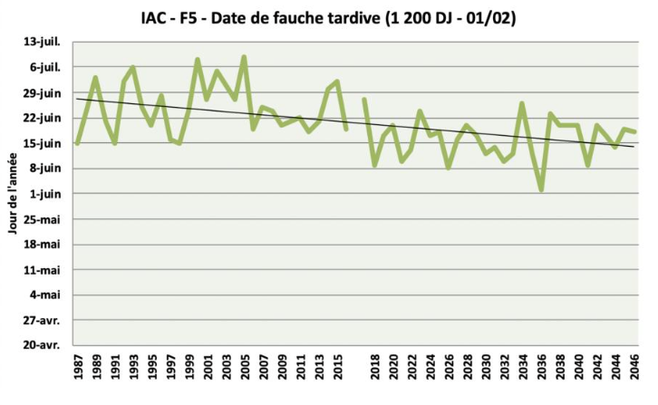 L’atteinte du seuil de 1200 degrés jours initié au 1er février, correspondant au stade de la récolte des foins, va aussi connaitre une avancée de date par rapport à la période actuelle, avec ponctuellement des records de précocité lorsque les hivers/printemps seront particulièrement chaud comparativement à la normale.