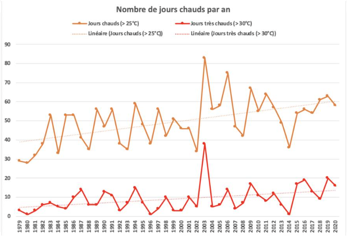 Le nombre de journées chaudes (Tmax > 25°C) et très chaudes (Tmax > 30°C) sont en hausse continue sur la période analysée. Avec 83 journées chaudes, l’année 2003 constitue le record en la matière.