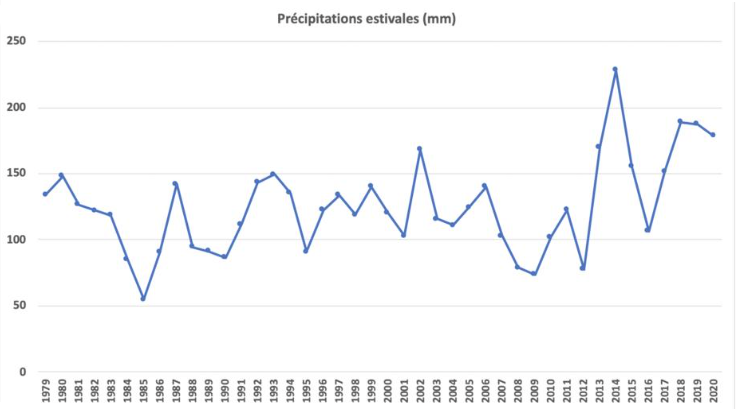 On observe un cumul de précipitations sur la période estivale (juillet, août, septembre) plus volatile dans la période la plus récente.