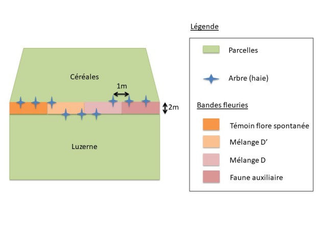 Les bandes fleuries permettent d'augmenter la biodiversité et sont des refuges pour les auxiliaires de cultures. Elles ont donc été implantées le long d'une parcelle de céréales et ont été organisées sur 3*100m sur 2m.Implantées dans le cadre d'un projet test, les bandes fleuries, composées de pluriannuelles, sont ressemées par fauchage.