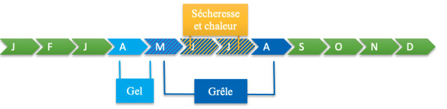 Pour l’aléa de sécheresse, ce sont majoritairement les grandes cultures de l’exploitation qui sont touchées. Le rendement des céréales peut être divisé par deux lors d’années sèches, à cause d’un fort stress hydrique au printemps et à l’été. Pour la vigne, la sécheresse renforce les effets de la chaleur et pousse les ceps à mobiliser plus de ressources en période de stress.