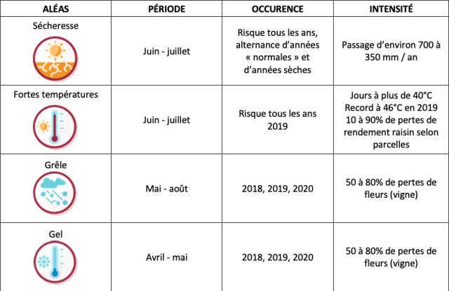 Fortes températures : Les fortes températures affectent la vigne en grillant les raisins, les feuilles et même les ceps. Certains pieds viennent même à mourir. Des coups de soleil apparaissent sur les fruits et les feuilles. Les impacts peuvent aller de 10 à 90% de pertes de récolte selon les parcelles. De plus, le cycle de la vigne est décalé : la date du redémarrage de la vigne (levée de dormance) est avancée à cause de la chaleur, et les récoltes se font donc plus tôt. Enfin, la chaleur favorise l’apparition de nouveaux ravageurs sur vigne.