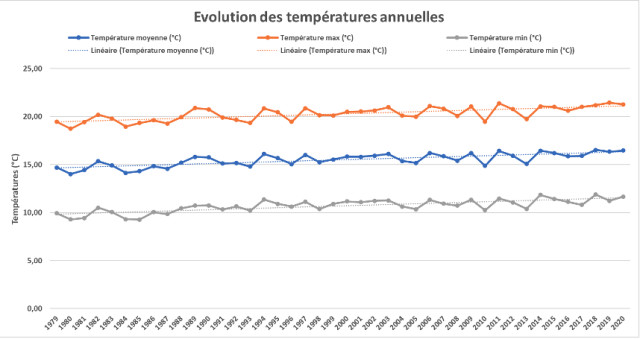 La hausse tendancielle des températures annuelles se confirme localement sur la période d'analyse, à l'image de la situation plus générale en France. Cette hausse concerne tous les paramètres (températures moyennes, minimales et maximales) et provoque ici des dégâts sur les vignes et un décalage du cycle (voir plus bas). On observe également une hausse des jours chauds (> 25°C) et des jours très chauds (> 30°C).