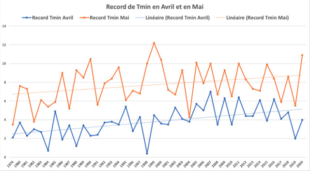 Ce graphique présente l’évolution des températures minimales d’avril et mai. On ne remarque qu’aucune des années n’a eu des températures minimales en dessous de 0. Donc le gel ne se remarque pas sur ces données. On peut donc supposer des différences dues au territoire : le gel subit de 2018 à 2020 par Philippe Delmas n’a pas dû avoir lieu à la station météo de la zone. Comme le déclarait l’agriculteur, ces gelées étaient très localisées. Dans tous les cas, d’après les déclarations de l’agriculteur et le graphique, on ne peut pas conclure à une augmentation du gel tardif sur les 40 dernières années.