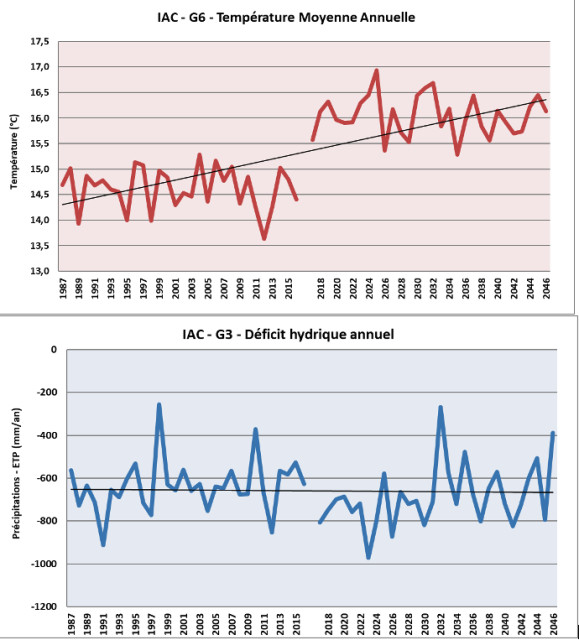 L'inertie climatique à l'échelle du globe implique une continuité des évolutions climatiques déjà observées localement dans les prochaines décennies. Les Indicateurs Agro-Climatiques suivant sont construits à partir des projections climatiques locales et illustrent les principaux enjeux climatiques pour un système viticulture et grandes cultures.