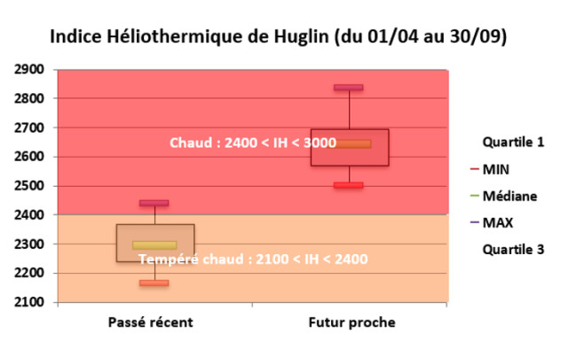 L'indice climatique viticole développé par Huglin (1978) est lié aux exigences thermiques des cépages et, également, aux taux potentiels de sucre du raisin. Dans le futur proche chez Philippe Delmas, l'IH évoluera principalement de la classe "tempéré chaud" à "chaud", ce qui implique des adaptations de cépages pour éviter des plus grandes pertes de rendement dues à la chaleur et des vins trop alcoolisés (car raisins trop sucrés).