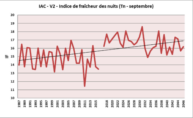 L'indice de fraicheur des nuits (IF) est basé sur la moyenne de températures minimales nocturnes (Tn) pendant la phase de maturation du raisin, allant d'Août à Septembre. Il est étroitement associé à la qualité du vin (des nuits plus fraîches sont associées à une expression aromatique plus intense). Ici, l'indice de fraîcheur des nuits augmente, rentrant dans la catégorie « Nuits tempérées » (14<IF<18) à l'horizon 2050.