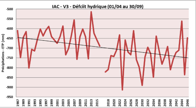 Cet indicateur cumule les déficits hydriques journaliers entre début avril et fin septembre. Il caractérise la composante hydrique d'une région, fortement liée aux caractéristiques qualitatives potentielles du raisin de cuve et du vin. On remarque ici une augmentation tendancielle de ce déficit.  Il peut être un bon indicateur pour les céréales de l’exploitation. Cela correspond également aux étapes de montaison puis de remplissage de l’épi de céréale. Ainsi, l’aléa de sécheresse tend à augmenter dans les 30 prochaines années, et pourra avoir des impacts supplémentaires sur les vignes et les grandes cultures de l’exploitation.