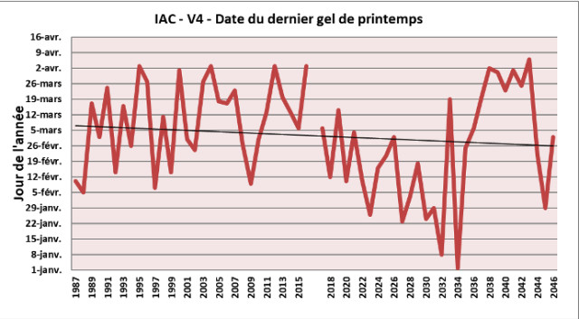 Cet indicateur présente la date du dernier gel de printemps. En effet, c’est à cette période que les vignes sont en fleurs, et que le gel est le plus problématique car peut impacter très fortement le rendement. On remarque que cette date recule à l’horizon 2050, jusqu’à fin février environ si on suit la tendance. Cela peut paraître rassurant vis-à-vis de la floraison, mais celle-ci aura peut-être tendance à devenir plus précoce du fait des hivers plus doux. De plus, il y a aussi une forte variabilité interannuelle, qui pourra rendre la gestion du vignoble et de la production plus compliquée.
