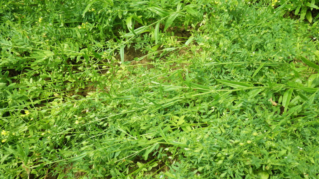 Philippe Guichard aime expérimenter plusieurs associations de cultures et recherche une efficacité agronomique et économique. Auparavant, il a testé plusieurs associations comme de la féverole avec du tournesol, du blé dans du trèfle, de l’épeautre dans de la luzerne… tout ce qui regroupe des céréales dans des légumineuses ! Cette année, il associe la lentille avec la cameline et le pois avec l’orge.
