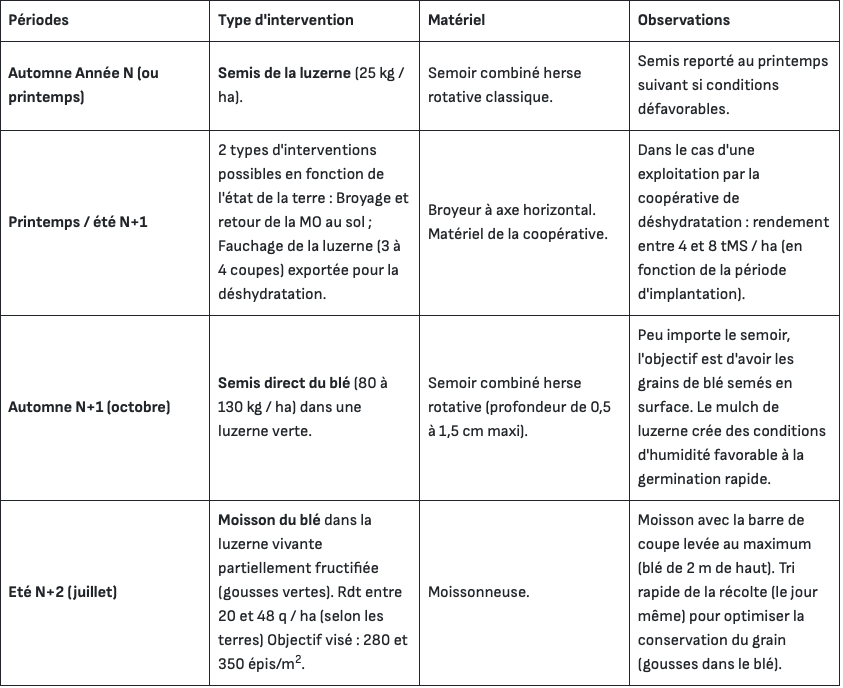 Itinéraire cultural type pour le SCV de blé (ou céréales d’hiver à pailles hautes) dans la luzerne vivante