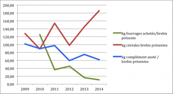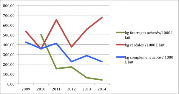 Les achats de foin à l'extérieur sont en forte baisse (un seul achat de 3 tonnes de pulpe de betterave en 2014). Les compléments azotés sont également en baisse. Quant aux céréales (maïs, avoine, orge), leur quantité est en augmentation pour accompagner la hausse de production laitière (elles assurent la part d'énergie nécessaire dans la ration).