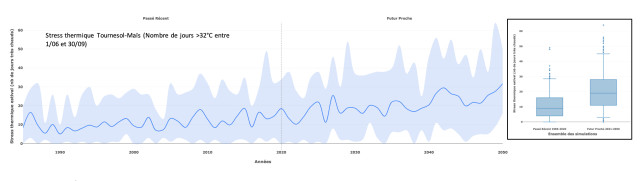 La situation est identique sur la période estivale avec une augmentation très significative du nombre de journées dont la température maximale dépasse 32°C. Ponctuellement, des records de jours très chauds peuvent s’établir à près de 19 jours sur la période estivale. Cela traduit un durcissement des conditions de cultures, avec un stress thermique significatif pour le tournesol sur la ferme, et des difficultés lors de la coïncidence avec la phase de pollinisation.