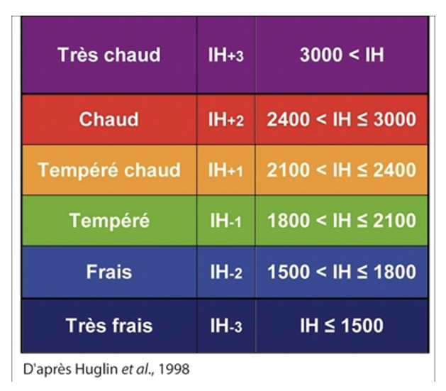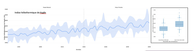 L’indice héliothermique de Huglin (IH) est un indice de chaleur bioclimatique permettant une classification des climats viticoles, et permet d’avoir une idée du potentiel en sucre de différents cépages dans un contexte donné. Localement, l’évolution tendancielle des températures ferait évoluer l’IH de la classe actuelle « Tempéré chaud » vers la classe supérieure « Chaud », ce qui induit une évolution des cépages cultivés.]