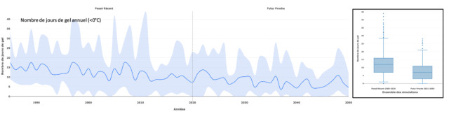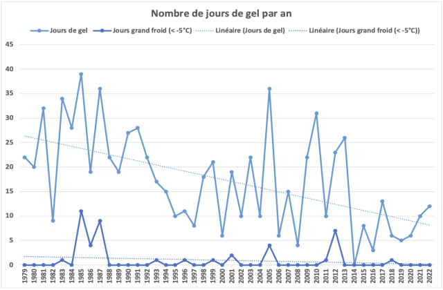 Le nombre tendanciel de jours de gel par an est en régression, avec depuis 2014 un faible nombre de jours de gel cumulés chaque année (moins de 15 jours/an, valeurs inférieures à la moyenne sur la période).