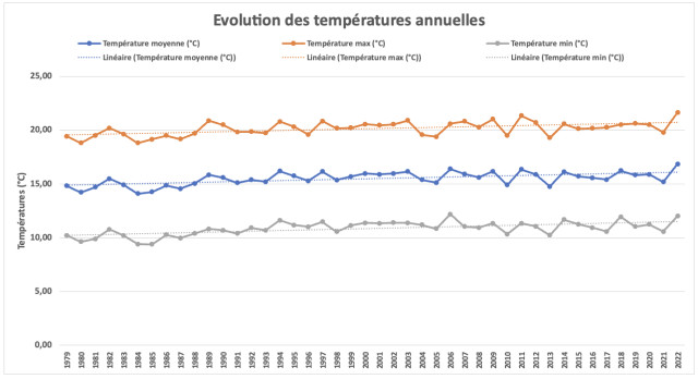Les températures annuelles semblent être en hausse tendancielle, à l’image de la situation générale en France, même si cette hausse est relativement peu marquée. Cependant, la moyenne de cette série climatique est de 15,50°C ce qui est très élevé en comparaison avec la moyenne française. Cette hausse tendancielle concerne principalement les températures moyennes et minimales. Les conséquences concernent donc le raccourcissement des durées des cycles de développement des cultures, avec des dates de maturités plus précoces (somme de degrés jours plus importante).