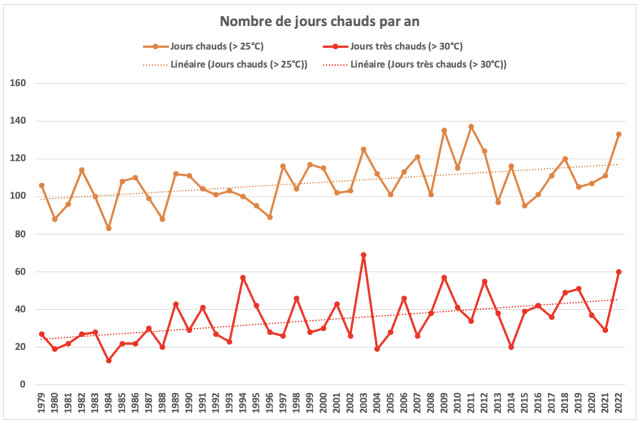 Le nombre de jours chauds (Tmax > 25°C) et très chauds (Tmax > 30°C) sont en hausse tendancielle et semblent témoigner d’une dynamique similaire. Les années les plus récentes sont caractérisées par un indicateur de nombre de journées très chaudes (Tmax > 30°C) relativement important (plus 36 jours par an, supérieur à la moyenne sur la période).