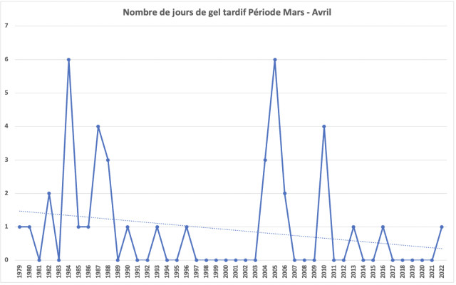 Toutefois, l’intervention de températures négatives au printemps (mois de mars et avril) subsiste ponctuellement, sur une végétation qui a tendance à être davantage développée par la hausse tendancielle des températures.