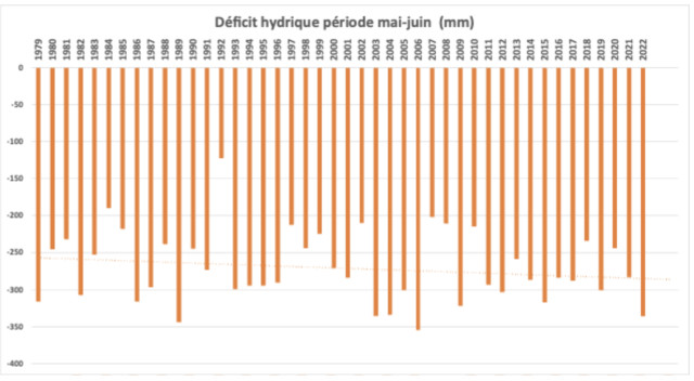 Le déficit hydrique est calculé par la différence entre pluviométrie et évapotranspiration, il est cumulé sur le graphique ci-dessus pour la période mai-juin. Les dernières années sont caractérisées par des valeurs systématiquement élevées de déficit hydriques, souvent supérieures à la moyenne.