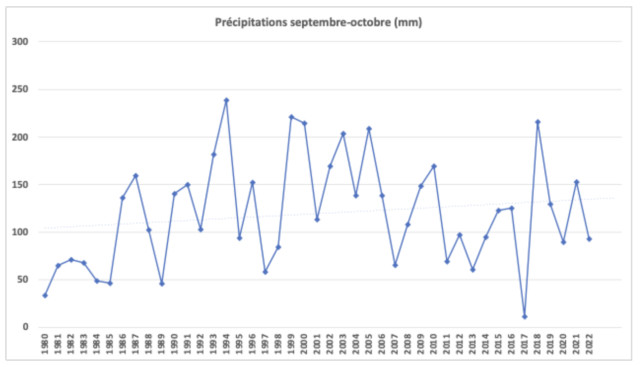 Voici le cumul des précipitations sur la période septembre – octobre, déclarée comme problématique par l’agriculteur à cause d’excès en eau. La tendance sur les 40 années est à l’augmentation, avec une forte variabilité interannuelle sur les 10 dernières années environ.