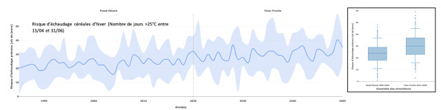 Le nombre de journées échaudantes (température maximale dépassant 25°C), déjà en hausse ces dernières années, semble se renforcer sensiblement dans les 30 prochaines années, avec très régulièrement des valeurs élevées à très élevées. Les enjeux d’adaptation vont donc se renforcer, notamment pour les céréales (échaudage de fin de cycle, précocité des moissons, etc.).