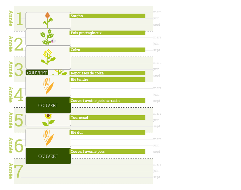 Les faibles résidus du pois limitent le développement des maladies du colza au collet. De plus, le colza valorise très bien les reliquats azotés du pois et ses repousses forment un couvert végétal apprécié des limaces. Ainsi, le blé tendre semé dans les repousses de colza est beaucoup moins prisé des limaces. Un couvert d’avoine et de pois est implanté avant tournesol. Le tournesol et le blé dur terminent cette rotation.
