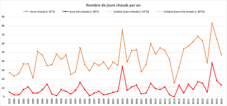 La tendance est identique pour le nombre de journées très chaudes (> 30°C) qui progresse continuellement, avec régulièrement des valeurs proches ou supérieures à 15 jours par an ces dernières années et avec 2 années records, dépassant les 30 journées très chaudes : 2003 et 2022.