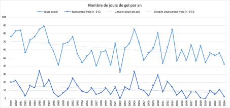 Le nombre tendanciel de jours de gel par an est en régression, avec depuis 2014 une baisse notable du nombre de jours de gel cumulés chaque année, ne dépassant plus les que très rarement les 60 jours/an, valeurs inférieures à la moyenne sur la période. Le nombre de jours de grand froids (température <5°C) est également en régression avec, régulièrement les 10 dernières années, aucune journée sous les -5°C : 2016, 2019, 2020.