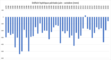 Le déficit hydrique est calculé par la différence entre pluviométrie et évapotranspiration, il est cumulé sur le graphique ci-dessus pour la période juin à octobre, déclarée comme des périodes particulièrement sèches par l’agriculteur. Les dernières années sont caractérisées par une forte variabilité du déficit hydrique estival, avec mis en évidence les années particulièrement marquantes : 2003, 2009 et 2022.