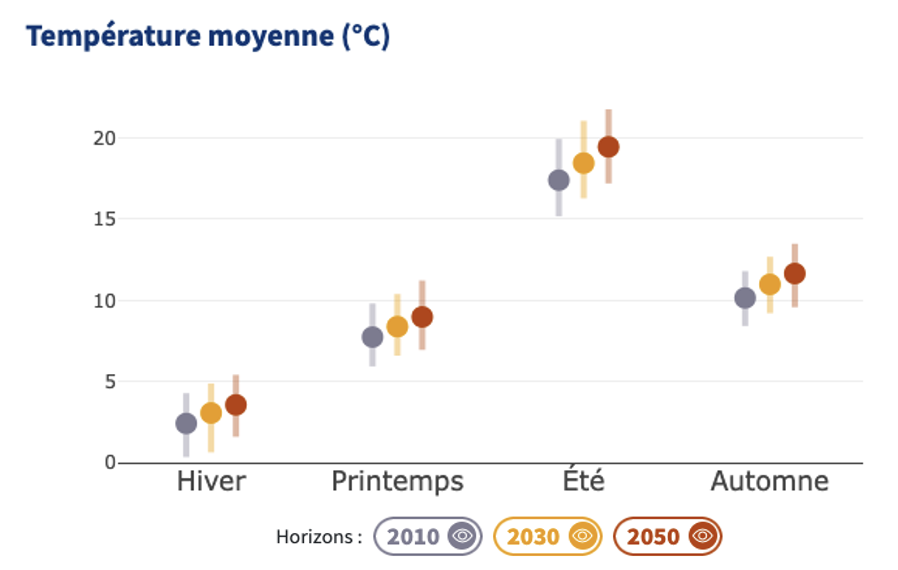A l’échelle de la France, la température moyenne annuelle augmentera de près de 1,5 °C d’ici l’horizon 2030 par rapport au climat récent et de plus de 2 °C d’ici l’horizon 2050. Ce réchauffement montre toutefois une variabilité spatiale et saisonnière.