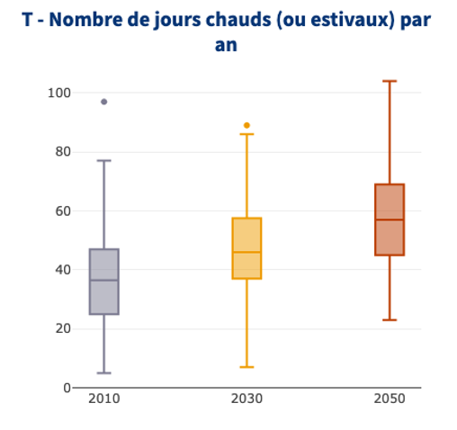 La hausse de l’occurrence du nombre de journées chaudes (> 25°C) déjà constatée devrait se poursuivre, pour passer d’une médiane à 37 journées estivales par an sur la période du passé récent à plus de 57 journées estivales par an à l’horizon 2050, soit une hausse de près de 20 jours. Les années les plus extrêmes pouvant dépasser les 100 jours.